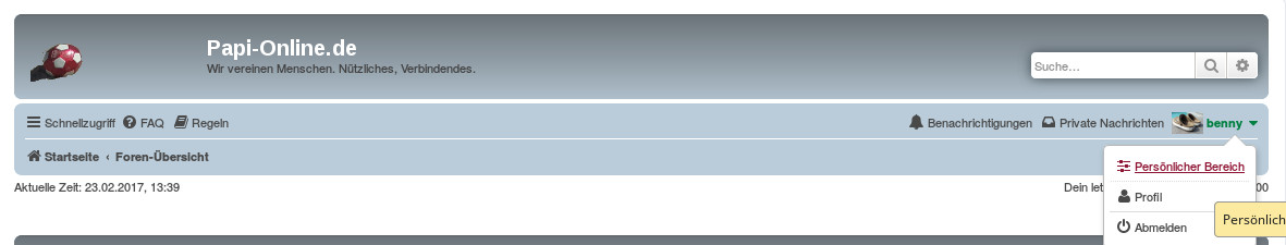 Ihr könnt die Benachrichtigungen ändern, indem ihr oben rechts euren Namen klickt und dort "Persönlicher Bereich" auswählt.